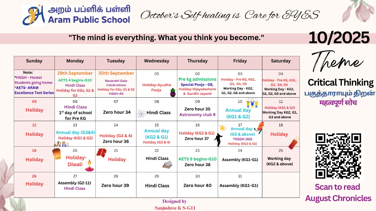 At Aram Public School, every month unfolds a new chapter of growth, celebration, and learning. October 2025 is dedicated to “Self-Healing and Care for Eyes”, inspiring students to nurture mindfulness and well-being. Guided by our theme of Critical Thinking (பகுத்தறிவும் திறன்), students engage in meaningful activities that shape both intellect and character.From Navaratri Golu and Annual Day to AETS Tests and Astronomy Club sessions, every event reflects our commitment to holistic learning. Festivals like Ayudha Pooja and Diwali add cultural vibrance, while assemblies and zero-hour programs nurture creativity and leadership